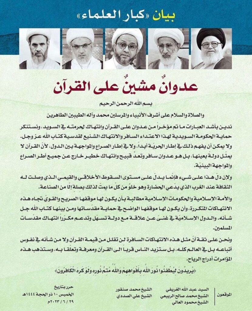 ندين بأشد العبارات ما تم مؤخراً من عدوان على القرآن وانتهاك لحرمته في السويد، ونستنكر حماية الحكومة السويدية لهذا الاعتداء السافر والانتهاك الشنيع لقدسية كتاب الله عز وجل. ولا يمكن أن يفهم ذلك في إطار الحريّة أبداً، ولا في إطار الصراع والمواجهة بين الدول، لأنّ القرآن لا يمثّل دولةً بعينها، بل هو عدوان سافر وتعدٍّ قبيح وانتهاك خطير خارج عن جميع أطر الصراع والمواجهة البينيّة.