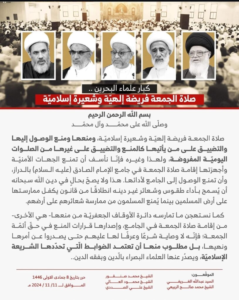 صلاة الجمعة فريضة إلهيّة وشعيرة إسلاميّة، ومنعها ومنع الوصول إليها والتضييق على من يأتيها كالمنع والتضييق على غيرها من الصلوات اليوميّة المفروضة، ولهذا وغيره فإنّا نأسف أن تمنع الجهات الأمنيّة وأجهزتها إقامة صلاة الجمعة في جامع الإمام الصادق (عليه السلام) بالدراز، وأن تمنع الوصول إلى الجامع لأدائها. هذا ولا يصحّ بحالٍ في دين الله سبحانه أن يُسمح بأداء طقوس وشعائر غير دينه انطلاقًا من قانون يكفل ممارستها على أرض المسلمين بينما يُمنع المسلمون من ممارسة شعائرهم على أرضهم.