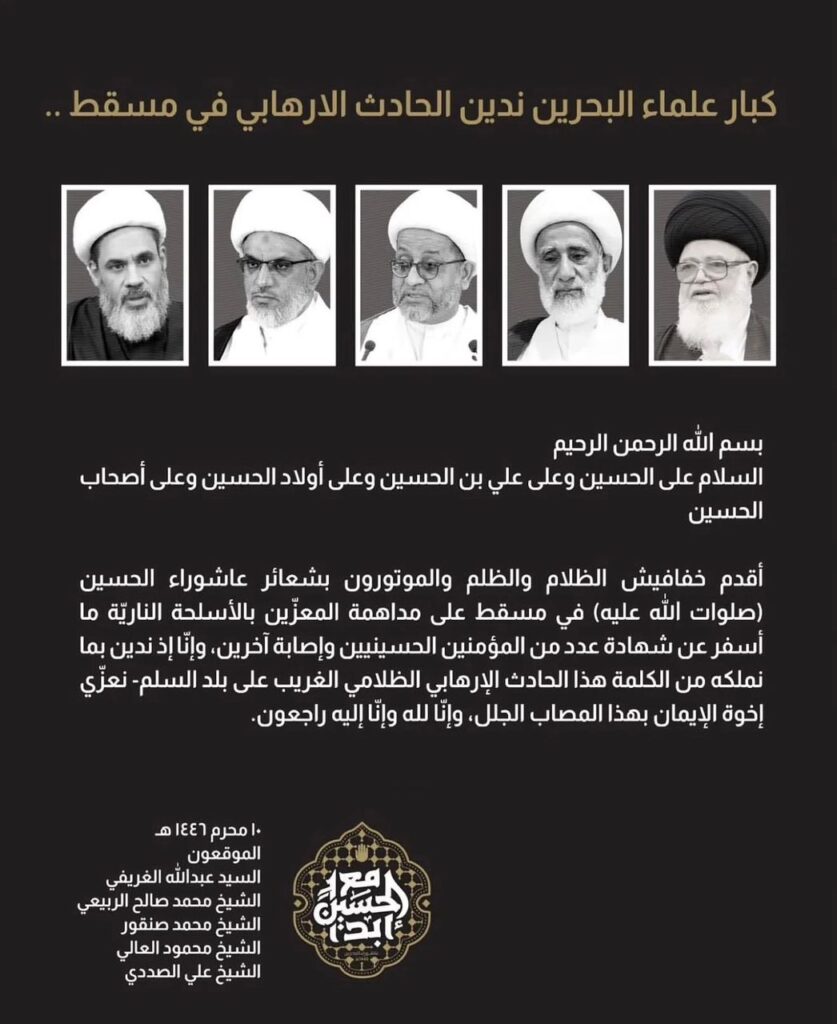 أقدم خفافيش الظلام والظلم والموتورون بشعائر عاشوراء الحسين (صلوات الله عليه) في مسقط على مداهمة المعزّين بالأسلحة الناريّة ما أسفر عن شهادة عدد من المؤمنين الحسينيين وإصابة آخرين، وإنّا إذ ندين بما نملكه من الكلمة هذا الحادث الإرهابي الظلامي الغريب على بلد السلم- نعزّي إخوة الإيمان بهذا المصاب الجلل، وإنّا لله وإنّا إليه راجعون.