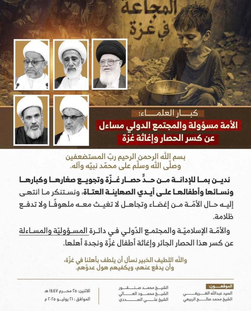 ندين بما للإدانة من حدٍّ حصار غزّة وتجويع صغارها وكبارها ونسائها وأطفالها على أيدي الصهاينة العتاة، ونستنكر ما انتهى إليه حال الأمّة من إغضاء وتجاهل لا تغيث معه ملهوفًا ولا تدفع ظلامة.